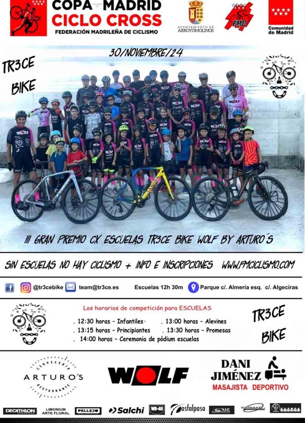 - ESCUELAS: https://fmciclismo.com/index.php/smartweb/inscripciones/inscripcion/29792-III-GRAN-PREMIO–TR3CE-BIKE-WOLF-CX-ESCUELAS–ARROYOMOLINOS—COPA-COMUNIDAD-DE-MADRID