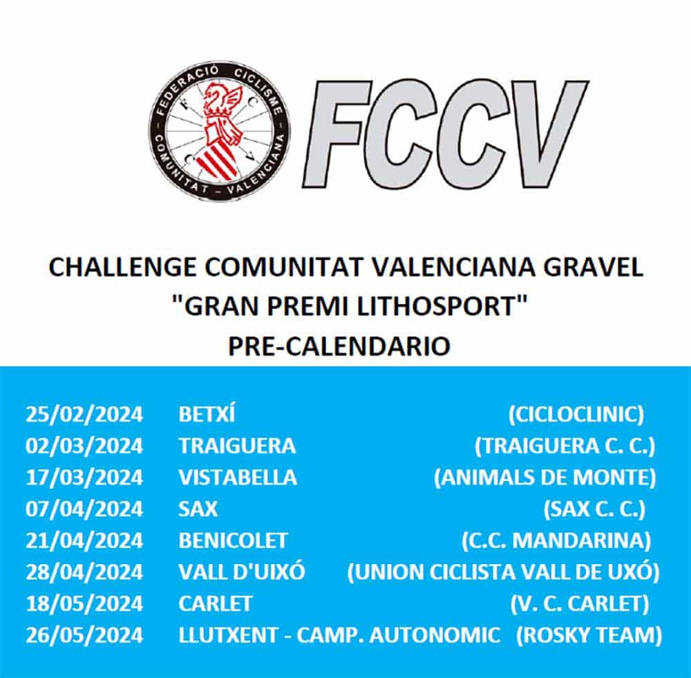Respecto al territorio valenciano, la I Challenge Comunidad Valenciana Gravel-GP Lithosport ya tiene un precalendario que consta de 8 pruebas: