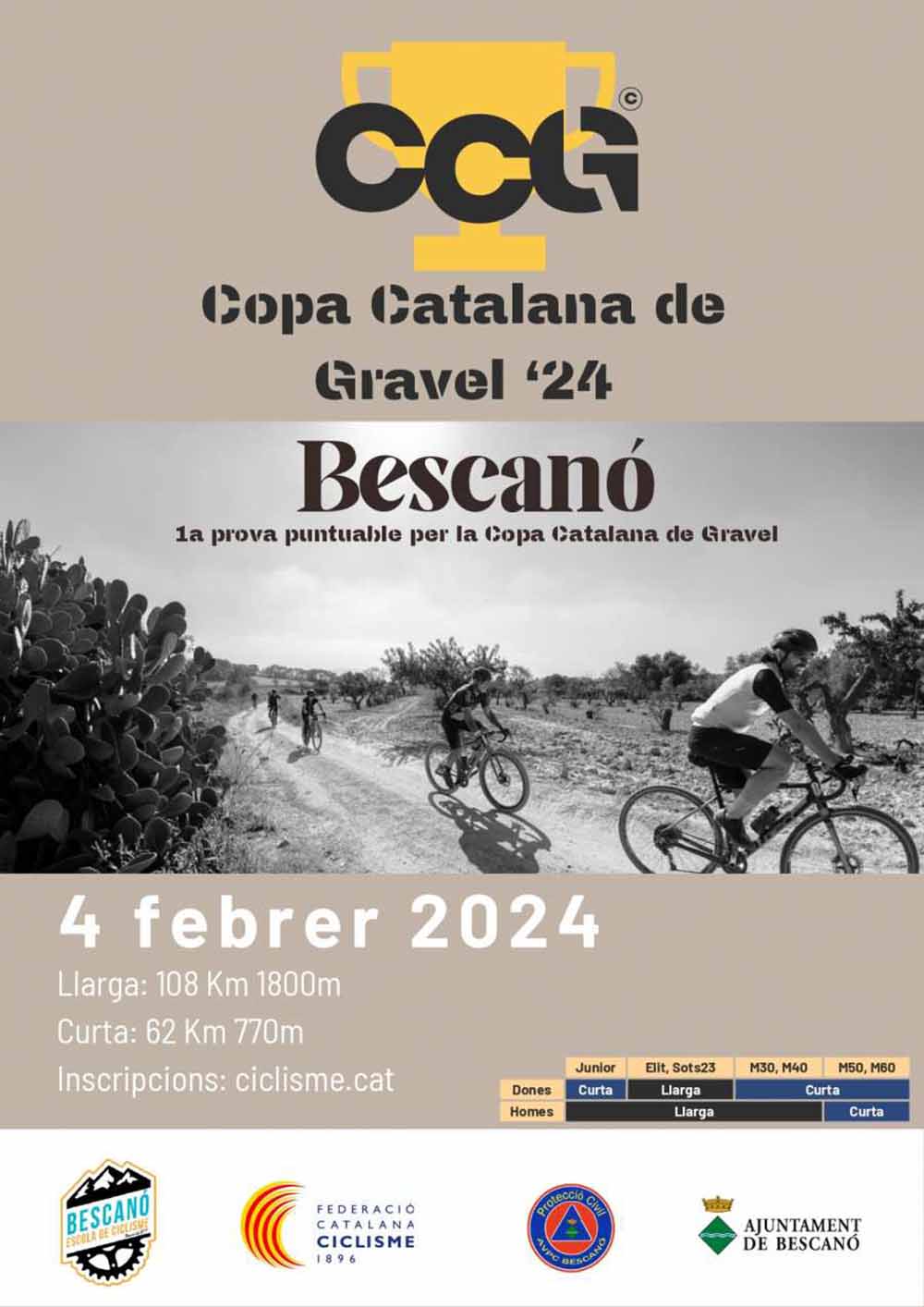 Así, el 4 de Febrero se disputará el Gravel La Bescanonina, en la local gerundense de Bescanó. Las inscripciones se pueden formalizar en este enlace: https://www.ciclisme.cat/inscripcions/int/5244314/ca. La segunda prueba de la Copa está prevista para el 18 de Mayo en Pratós de Luzanés (Barcelona), con la Gravel Luzanés. Además, se celebrará también el primer Campeonato de Catalunya de la disciplina en este recién nacido 2024.